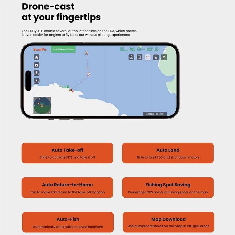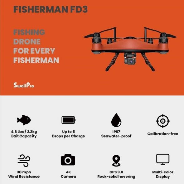 Aircraft x 1 Remote controller x 1 Flight battery x 1 Charger x 1 Propellers x 2 (pairs) Camera x 1 Bait release x 1 USB-C cable x 1 Charging cable x 1 Power adapter x 1 Phone mount x 1 Carry case x 1 |