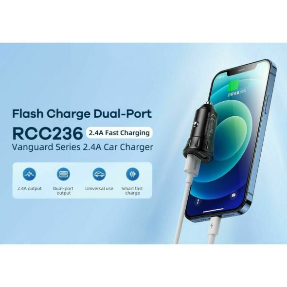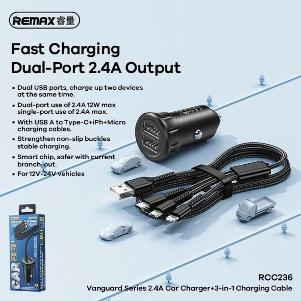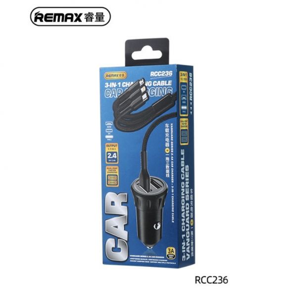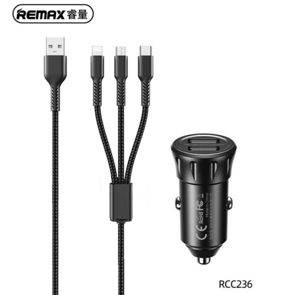 Φορτιστής αυτοκινήτου Remax RCC236 2.4A με 2 x USB και Καλώδιο 3 σε 1 Μαύρο