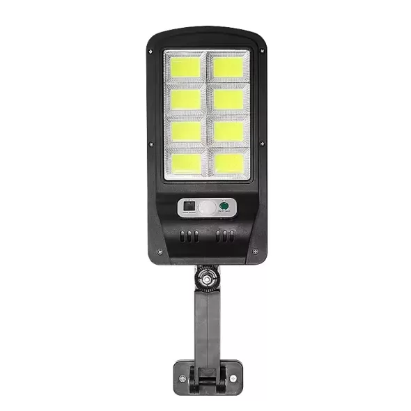 Αδιάβροχο ηλιακό φωτιστικό τοίχου σε μαύρο χρώμα, με 3 λειτουργίες και ψυχρό λευκό φωτισμό COB LED. Ο ενσωματωμένος αισθητήρας φωτός ενεργοποιείται αυτόματα με τη δύση του ηλίου, συλλέγοντας ηλιακή ενέργεια κατά τη διάρκεια της ημέρας.