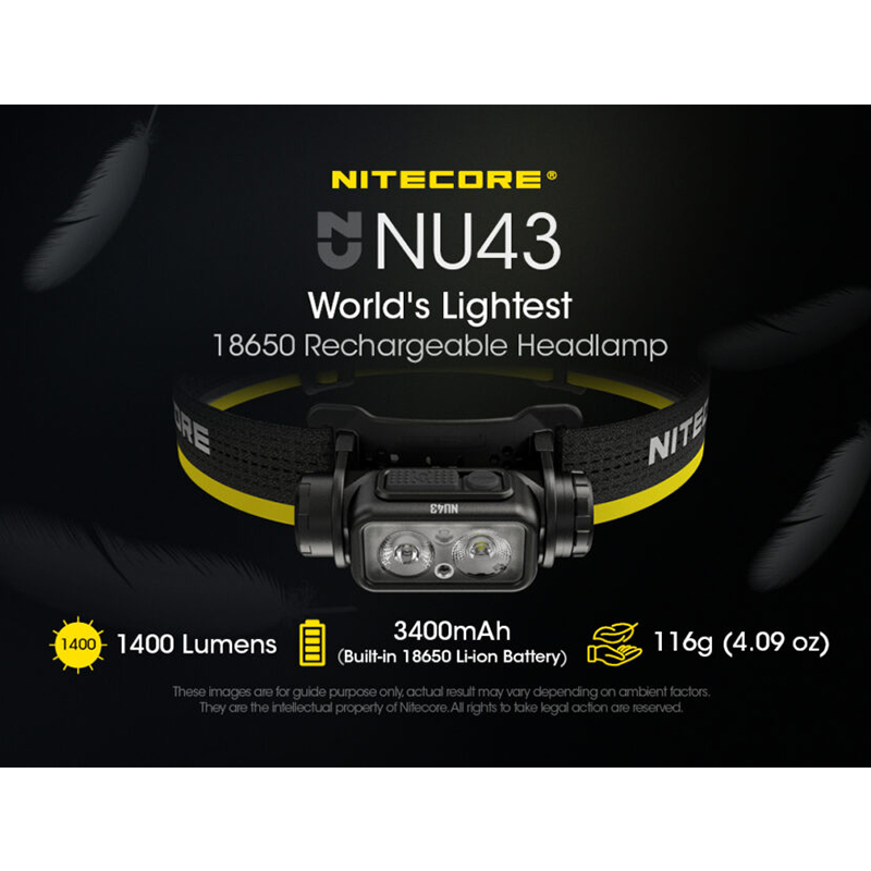 Με τον καινοτόμο σχεδιασμό της ενσωματωμένη μπαταρίας Li-ion 18650, ο NU43 μπορεί να παράξει φωτεινότητα μέγιστης ισχύος 1400 Lumens ενώ παράλληλα είναι ένας τέλειος συνδυασμός της μεγάλης χωρητικότητας 3400mAh και του πολύ χαμηλού βάρους των 116g σπάζοντας τους περιορισμούς στην απόδοση και την χωρητικότητα των κοινών φακών που λειτουργούν με μπαταρία 18650.